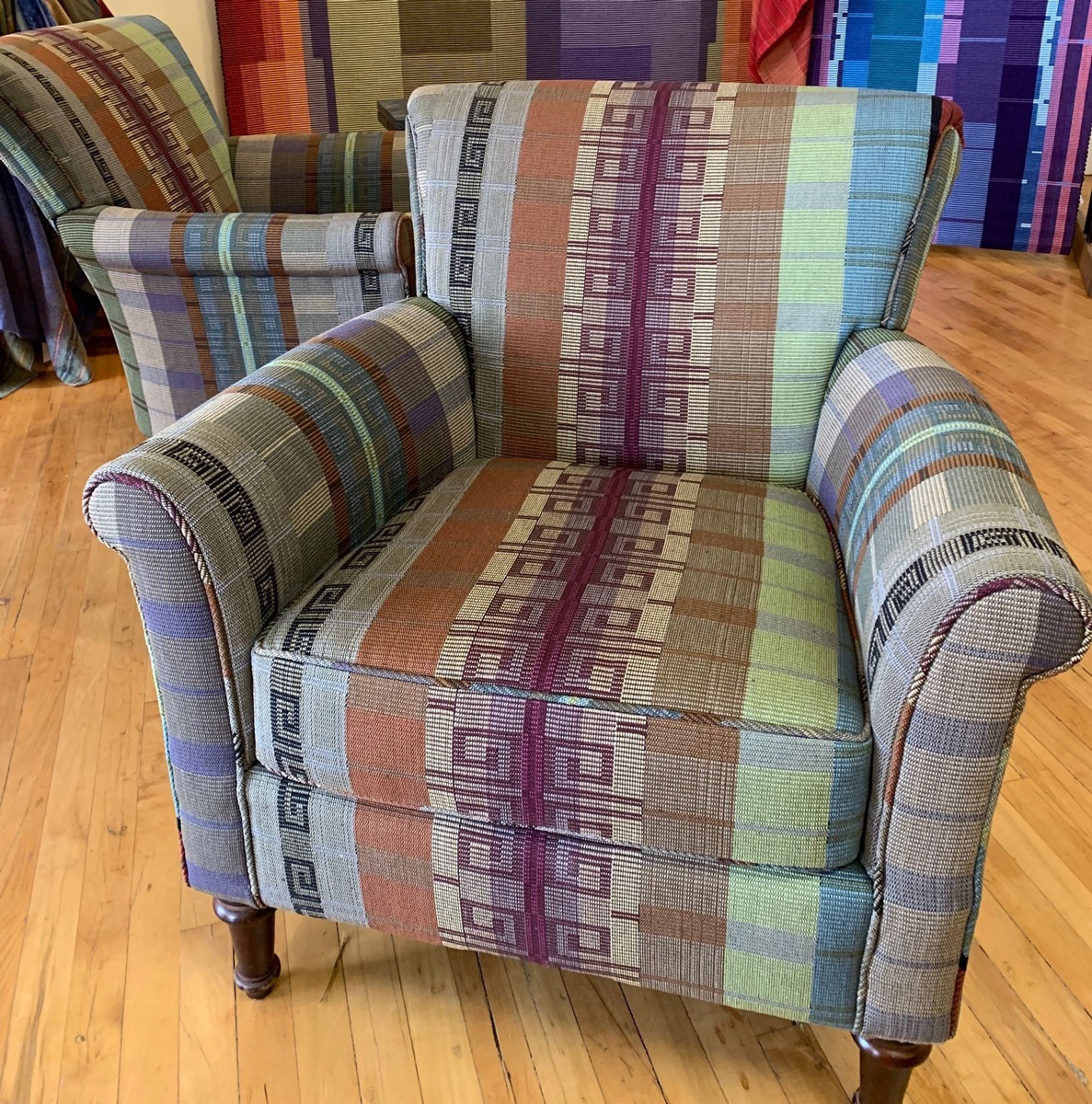 Two lovely matching club chairs in our Mayan fabric. A nice size to fit in any space, 36″ High, 33″ wide, 20″ seat depth. Original Room & Board hardwood chairs, great quality!