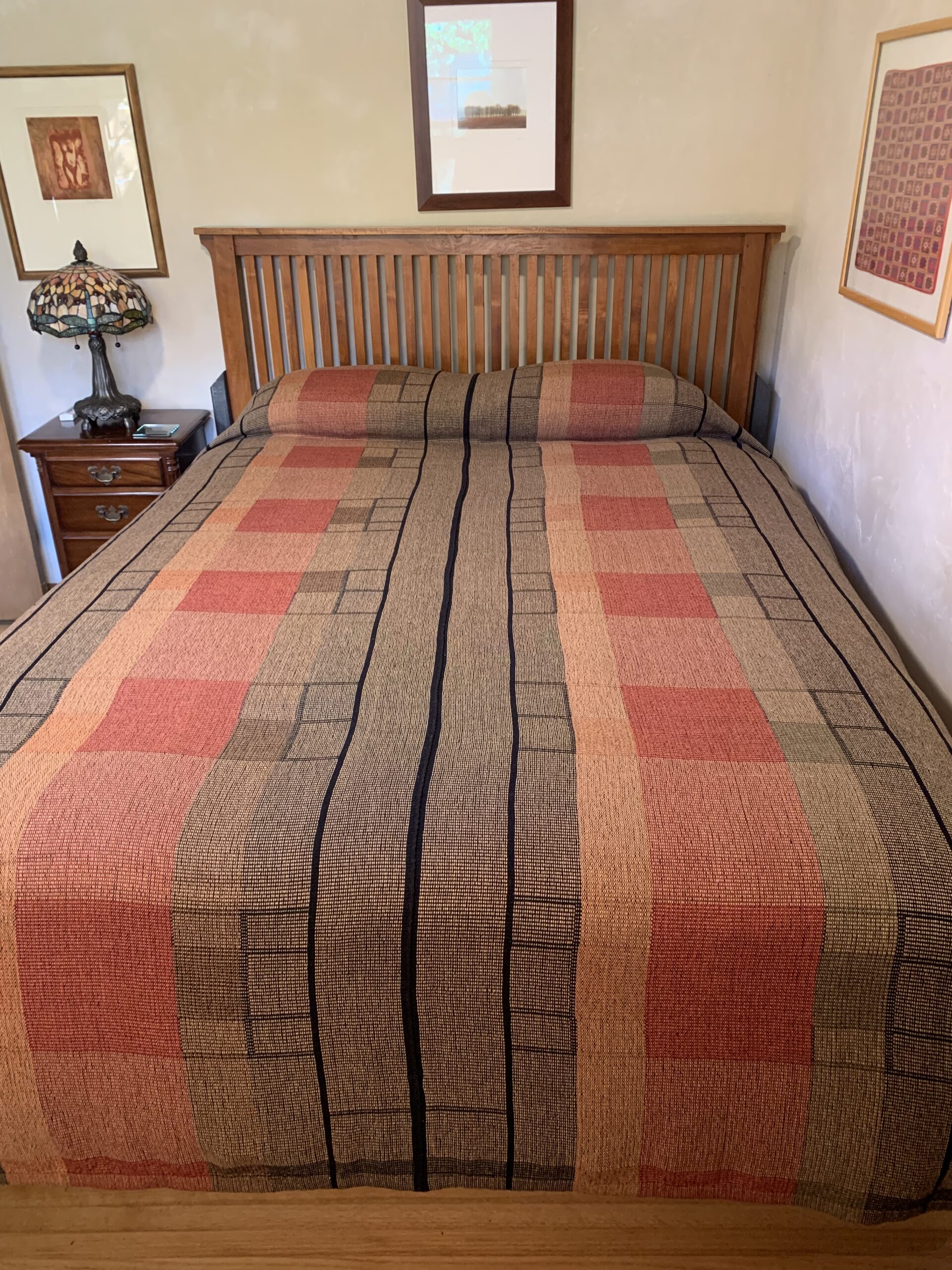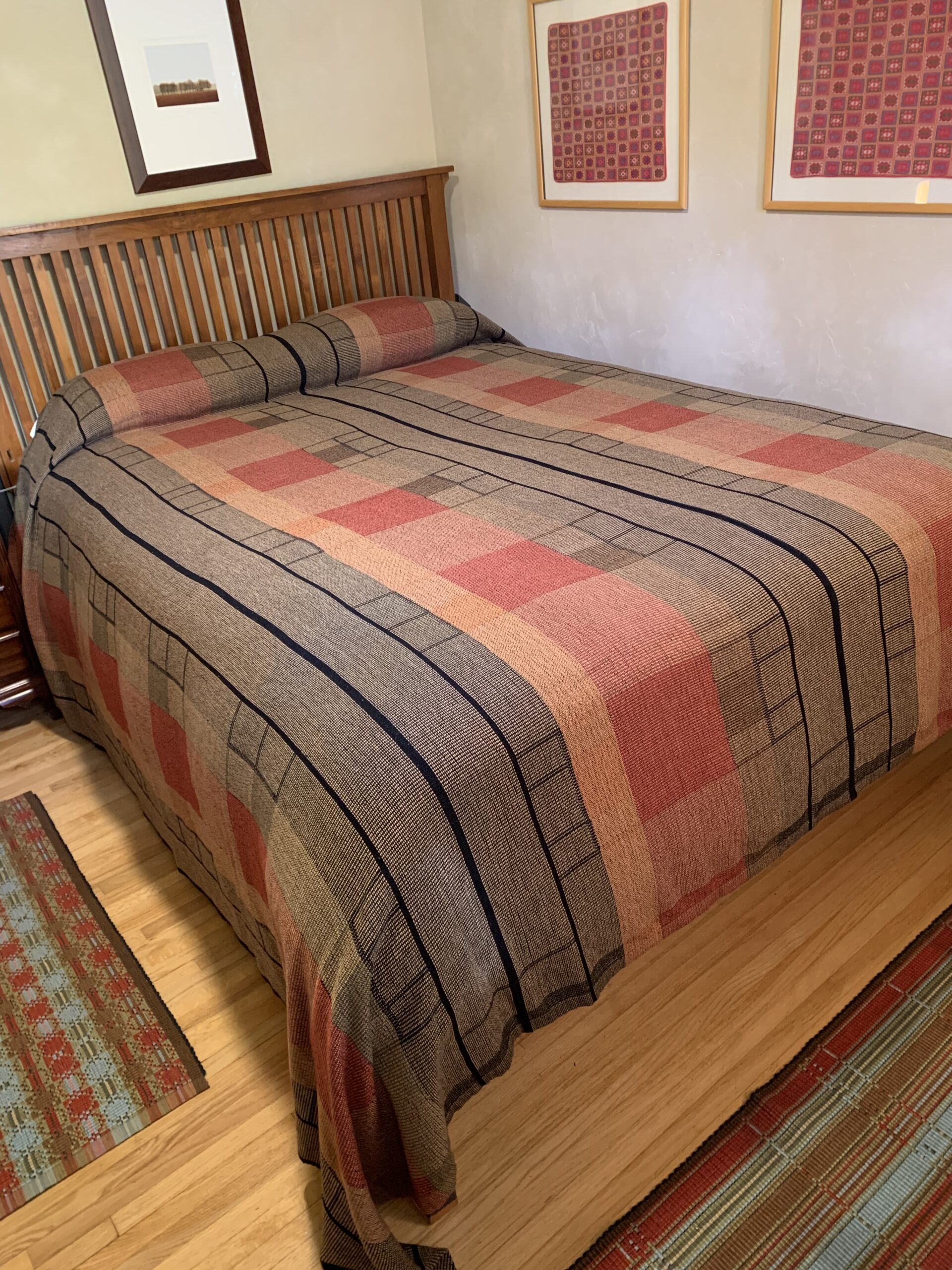 One of our signature Arts & Crafts designs, beige background with poppy red, olive green, rust and black. 46″ x 84″.