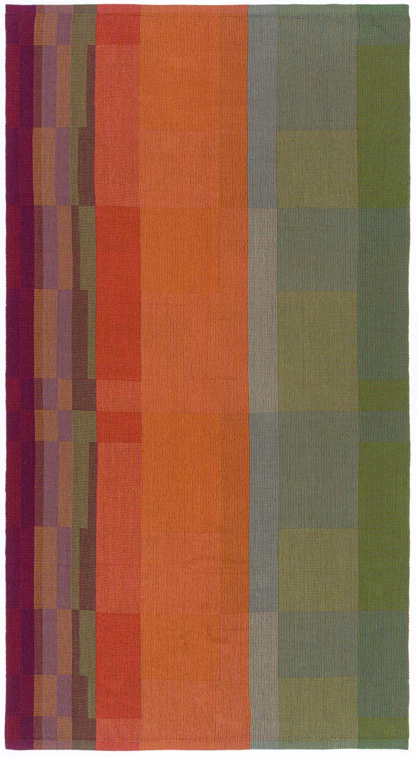 Contemporary modern design in blended shades of olive, salmon, poppy red, teal, accent purple and burgundy.